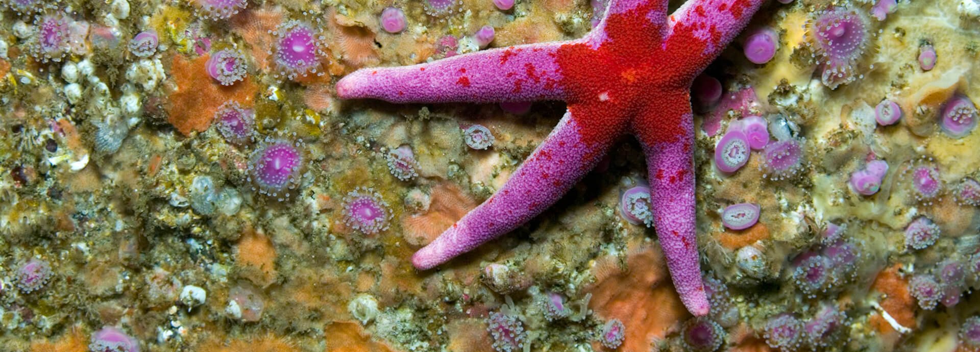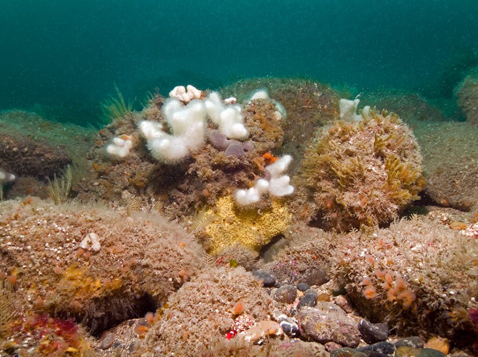 The submerged rocky reefs can be found around most of Llŷn Peninsula and can extend to more than 1km offshore. The different levels of exposure to wave action and tidal currents around the peninsula provide varied conditions for reef communities to develop. In general, the shallow water reefs around the Llŷn peninsula and Bardsey Island are dominated by dense growths of various kelp communities with an extensive and luxuriant turf of red seaweed species growing amongst and below the kelp. On the south side of the peninsula where there are boulder and cobble reefs surrounded by sediment, different communities develop with sugar kelp and other brown seaweeds being more common amongst a varied turf of red seaweeds and invertebrate animal species. As you get deeper and plants are no longer able to survive animal communities begin to dominate. They are made up of a wide variety of different species such as sponges, soft corals, sea anemones, sea firs (hydroids), sea mats (bryozoans) and sea squirts and associated mobile species.